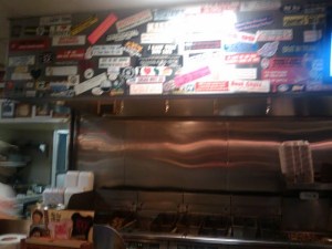 On the stainless steel above the grill, there was a wall of bumper stickers full of slogans. Some of our favorites were, “I wish I was Barbie because that B*** has everything” and the Blackhawks bumper stickers. We also noted bumper stickers for a host of cities and countries including Vancouver.