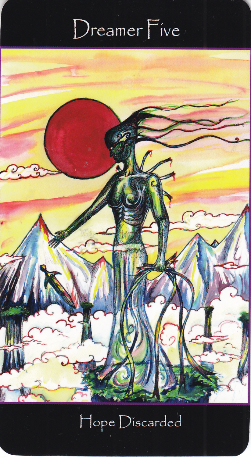 Dreamer Five–At first glance, this is a very depressing card as it is about hope being discarded and about powerlessness and resignation. However, I’ve learned that unrealistic hope can be unhealthy. Sometimes we cling to a dream that we hope will work out, but in reality we’ve outgrown that dream and it is time to move on. When we aren’t able to discard this hope and move on, it can hold us back. It’s really interesting that this card showed up for me because I am finally at a point in my life where I’ve let go of the hope that a relationship will work out with someone. Intellectually, I’ve known it for a couple of years, but int eh back of my mind I had hope that it would magically work out. Being able to let go of that hope means that I can finally move on and be ready for the right relationship for me.