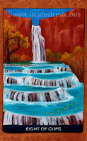 First Impressions: I love this card as she is actively drinking out of a cup as she heads off into the sunset. While most eight of cups cards give the impression that the figure is walking away from something, this one definately gives the impression she is walking toward something.