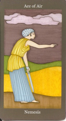 First Impressions: The first impressions of Nemesis are not positive. I get the impression that she is pointing at someone and giving them unsolicited advice or shaming them. However, she isn’t waving her sword around so I guess unsolicited advice is better than the alternative. I do love the colors on this card as the gold of her tunic is a slightly lighter color than the gold of the field. The ace of swords always tells me that this is about cutting through bullshit.