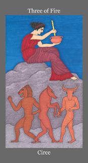 First Impressions: The first impression I get in looking at this card is that the three little beasts are waiting for Circe to fall off the hill. I believe that she is stirring up some kind of medical or magical potion and she needs to wait until it is perfect.