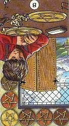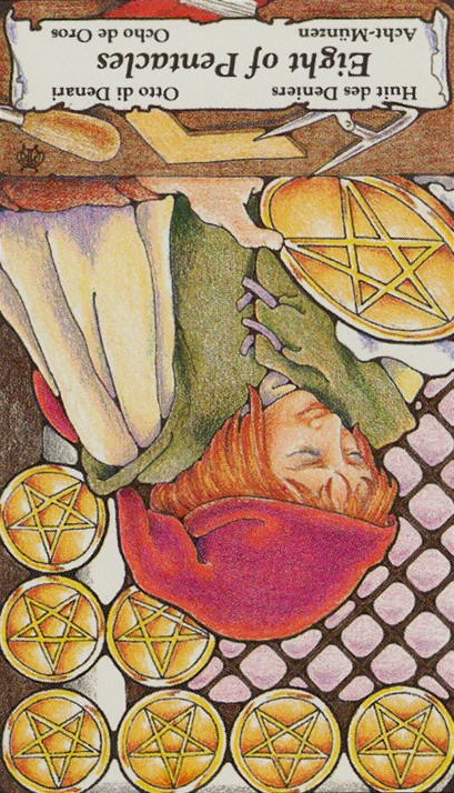 First Impressions:  The young man’s tools are carefully laid out and he clearly takes pride in his work as he is willing to make pentacles over and over and continually review what he does.  Reverse this card could indicate sloppiness, a loss of energy, or a loss of fortune.