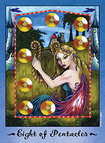 First Impressions:  The young boy is studiously making pentacles.  He has made a variety of pentacles with different wood and with different metal.  The eight of pentacles is about learning and growing, but reversed it may mean being stuck or not applying yourself.