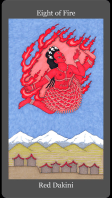 I have to be honest and say that I never really like the eight of rods/wands as it seems to be a boring card.  However, there are some versions okay with because you don’t know if the wands are going up or coming down.  In this version its pretty apparent they are coming down because in all of the rods, the blossoms have been shown pointing up.
