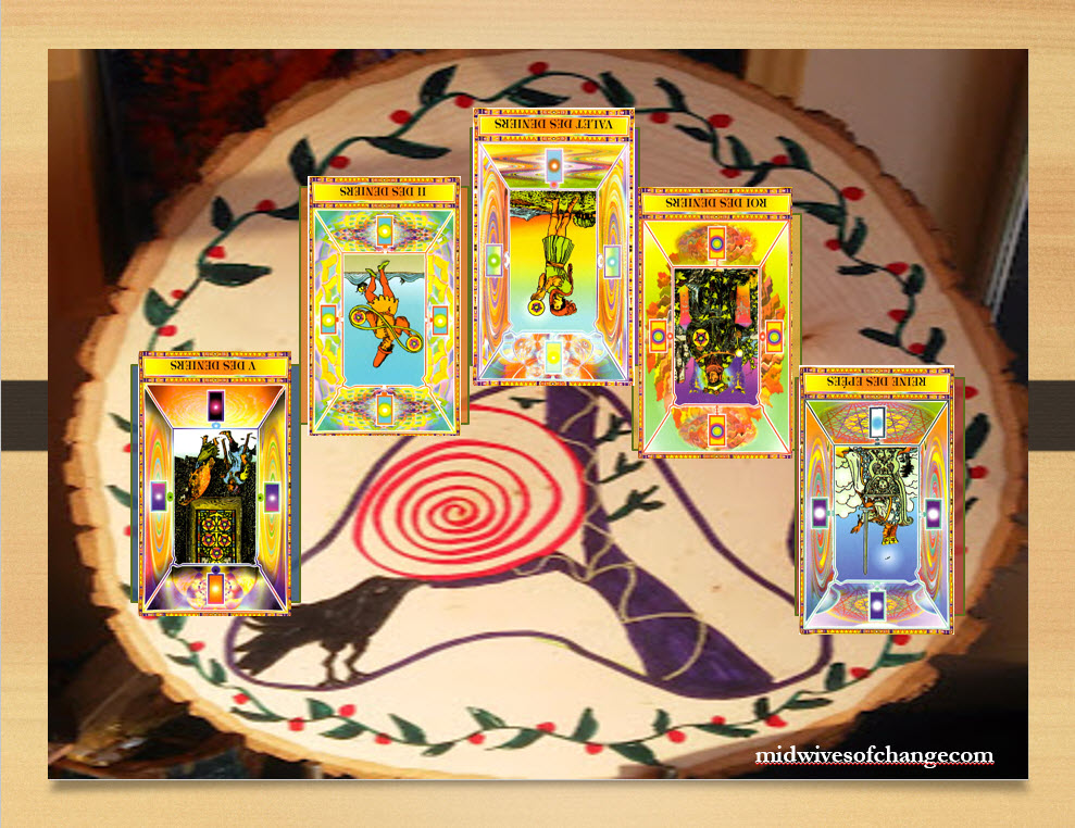 What I find so interesting in retrospect is that I pulled the five of earth, which is about pulling back my energy and being in survival mode immediately after I pulled the three of fire which is all about being out there and living out loud.  It is almost as if the thought of living out loud scared me and I had to pull back in my hermit shell.  It is also a good metaphor for where I’m at right now because my mind is coming up for all sorts of excuses as to why I don’t want to go to the tarot conference.  My brain is telling me that I won’t like it, that everyone will be cliquish, etc.