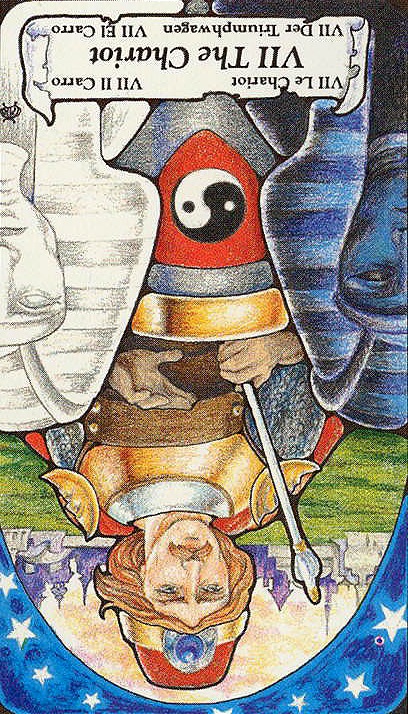 First Impressions:  The charioteer is male and there is a yin-yang symbol on the chariot.  Instead of horses, the chariot is being pulled by sphinxes.  There are half moons on the charioteers shoulders and his cap looks almost like that of a shriners.  He looks as if he is driving through an arch of stars.  In the background, there is a city.  Reversed this card speaks to me of out of control emotions.