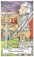 First Impressions:  I love how his sword is personalized with a purple embellishment.  He looks so resolute and ready to defend his land.  I also like the eagle on the standard behind him, which is echoed by the clasp of his cloak.  He looks to be middle aged, old enough to have wisdom but young enough to still do battle.  The king of swords is decisive and clear-headed.