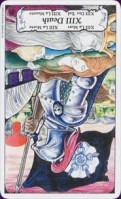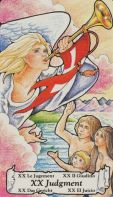 Initial Impressions: The people are naked and although it is supposed to be a family, they all seem very young. The cloud by the angel is pink. The people seem to be waving to the angel. I don’t know if they are just saying hi or if there is more to it than that. This card is about a reckoning and reawakening.