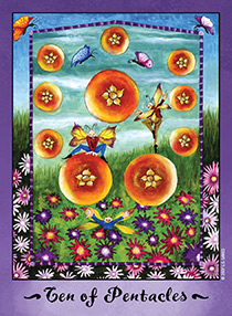 First Impressions:  Reversed this card gives a sense of loss, a sense of losing what’s important, and of losing footing. It could also mean a loss of independence or prosperity.  I do love how colorful this card is and the butterflies truly give it a sense of freedom