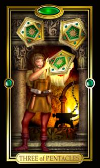 First Impressions:  The young boy is studiously making pentacles.  He has made a variety of pentacles with different wood and with different metal.  The eight of pentacles is about learning and growing, but reversed it may mean being stuck or not applying yourself.