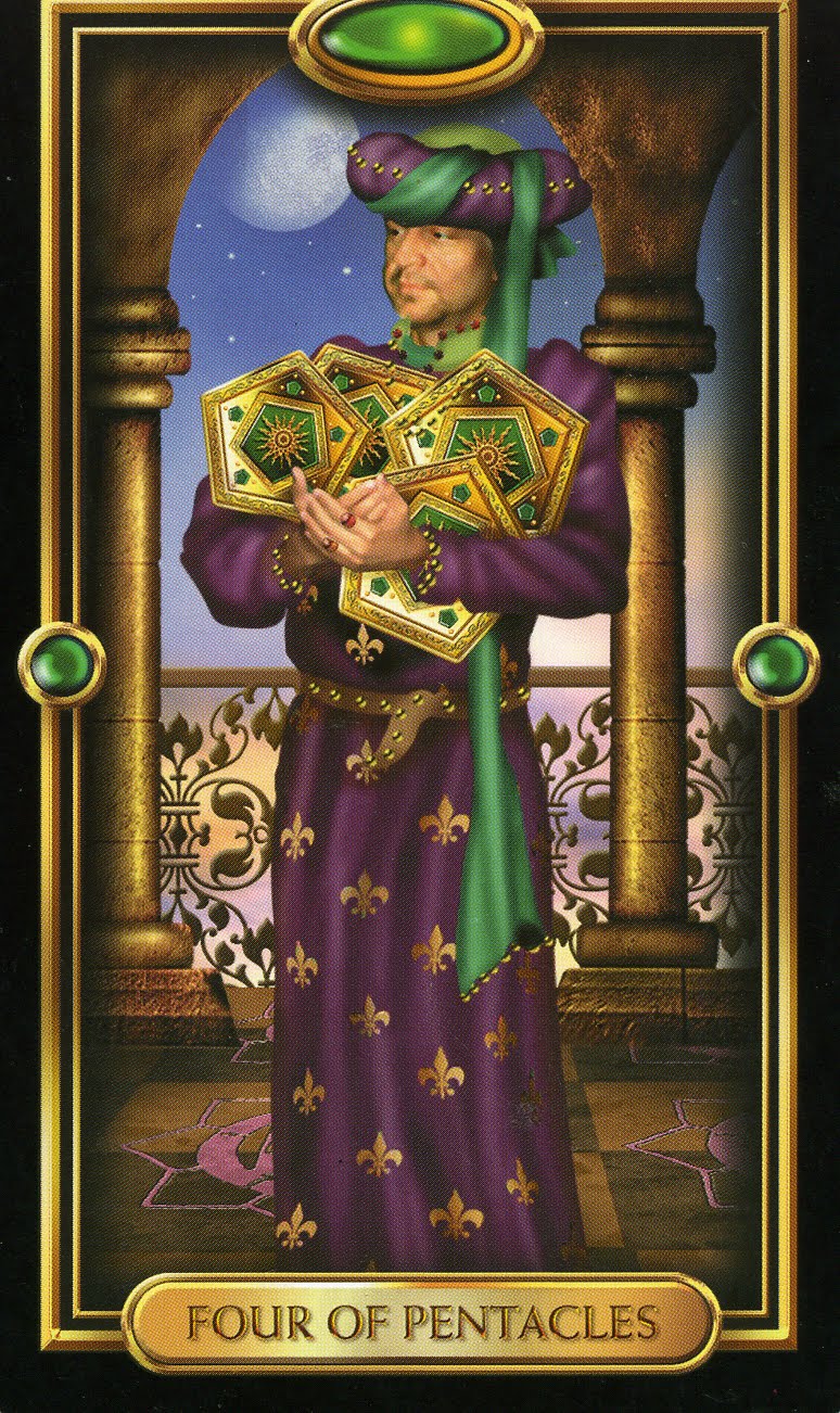I love this image of the four of pentacles with all of the pentacles held over his heart.  To me the message from this card is to let go of all the hurt I’m holding there.  I’m still holding on to anger and hurt from childhood and it’s time to let all of that go.  There is no value in holding on to those hurts.  I understand now how they’e negatively impacted me.