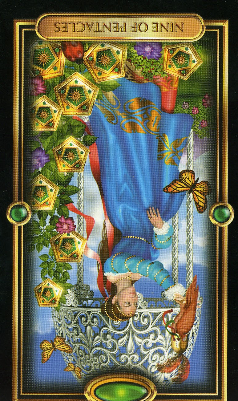 As I continue to grow in my tarot journey, one of the things that strikes me is how many different meanings there could be in a card.  I know the 9 of pentacles is usually read as a self made woman, but I wonder if another meaning could be someone who is in a gilded cage. Someone who has everything they want, except for freedom.  In some ways, I really feel like that’s where I’m at lately because I have everything I want, but I sometimes feel so trapped and as if it would be wonderful to just walk away from it all.  The nine of pentacles reversed could be about escaping from the gilded cage.