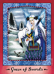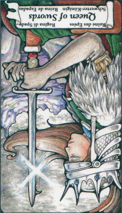 First Impressions:  She has sapphires in her crown and there is a ruby in her sword.  Like the King, she has personalized her sword and, like the King, the same X of light is hitting her sword.  The skin on her arms appears gray.  My first impressions of this card reversed are of defeat and expressing emotions (lack of emotional control?)