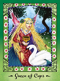 The Queen of Cups is always one of my favorite cards because in all the decks I have, she carries herself regally, but she is also very approachable.  That holds true in this deck as well as she looks like a woman who is enjoying her morning coffee.  Her air is a little bit messy and she’s holding the cup with two hands just like someone who really needs her morning caffeine.