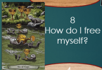 The dragonflies on the seven of cups tell me that it is my lack of alignment between my emotional wants and my intellectual thoughts that is keeping me caged.  Leeza says, “The Dragonfly connects the energy of the air with the creative power of water, letting you know that thoughts and dreams really can become real.  But first you have to use the energy of the Dragonfly to align your emotions with your thoughts.”  All I can say about this is WOW! because when I am really honest with myself, I can see that this is true.  Emotionally, I want to find the love of my life, but when I think about the reality of marriage, living together, etc., I find myself not wanting to share my house, my bank account, etc. with someone else.  I really like my independence and having a relationship would cut into that to a certain extent.  I think the truth of the matter is that I need to let the relationship that is right to me come to me and not get all caught up in the restrictions.
