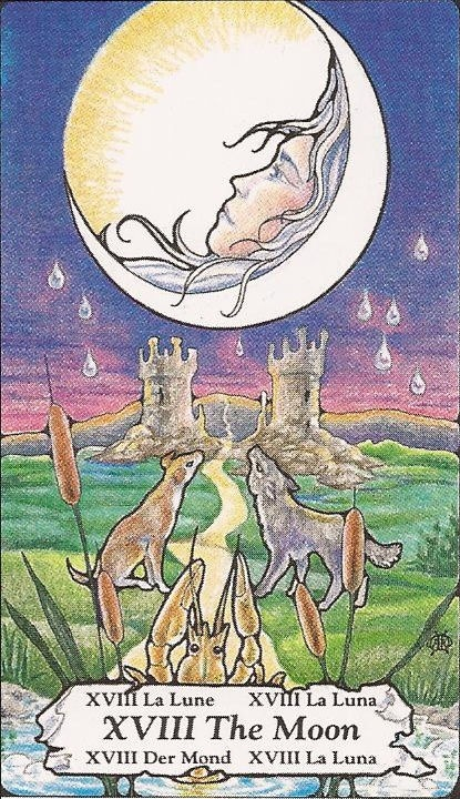 First Impressions:  I love the woman in the moon who is reclining as if she is on a pillow.  I also like that there are towers instead of pillars or rocks.  I also like that the crab is at the forefront of the card.  For me, this card always speaks to intuition and the darkness.  What I really like about this card is that it makes the darkness welcoming instead of scary.