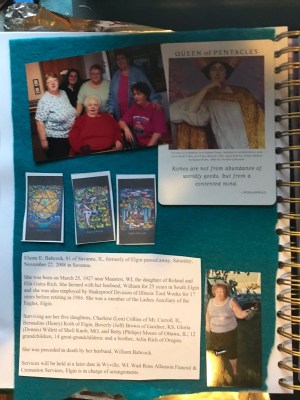 It was only when my daughter was diagnosed with bipolar and started to exhibit questionable behavior that I began to wonder if my grandmother had had undiagnosed mental illness that caused her to behave cruelly to others. I knew she had been trapped in an unhappy marriage and my emotions shifted from anger to more sympathy and I began to think about honoring her rather than dishonoring her. I set about finding photos, a copy of her obituary, and anything else I could gather. I also pulled the Queen of Pentacles from the Art Tarot deck, which quoted Mohammed, “Riches are not from an abundance of worldly goods, but from a contented mind.” And I said a quick prayer asking that she find contentment in the afterlife.